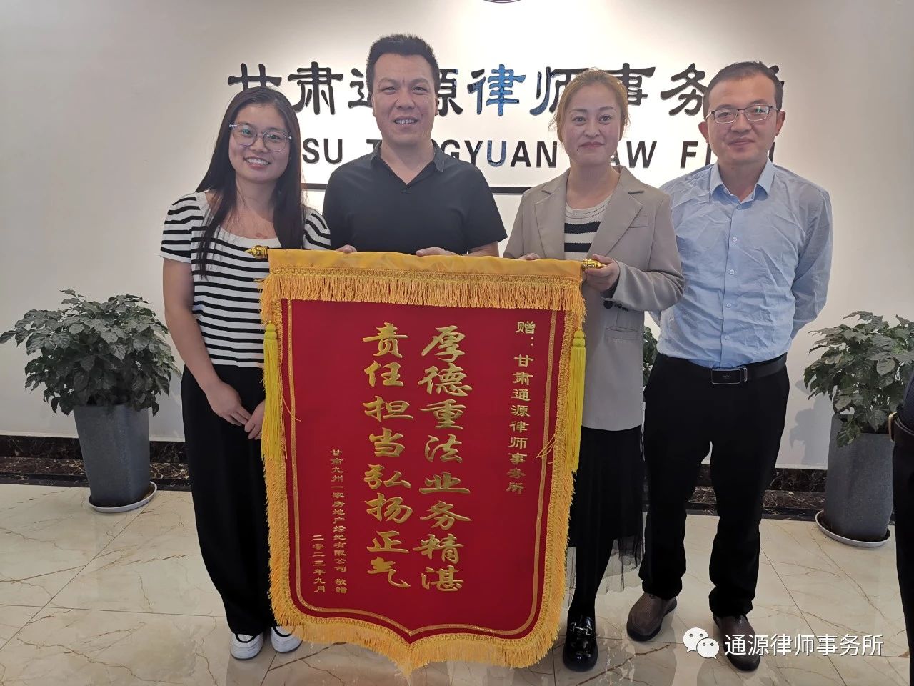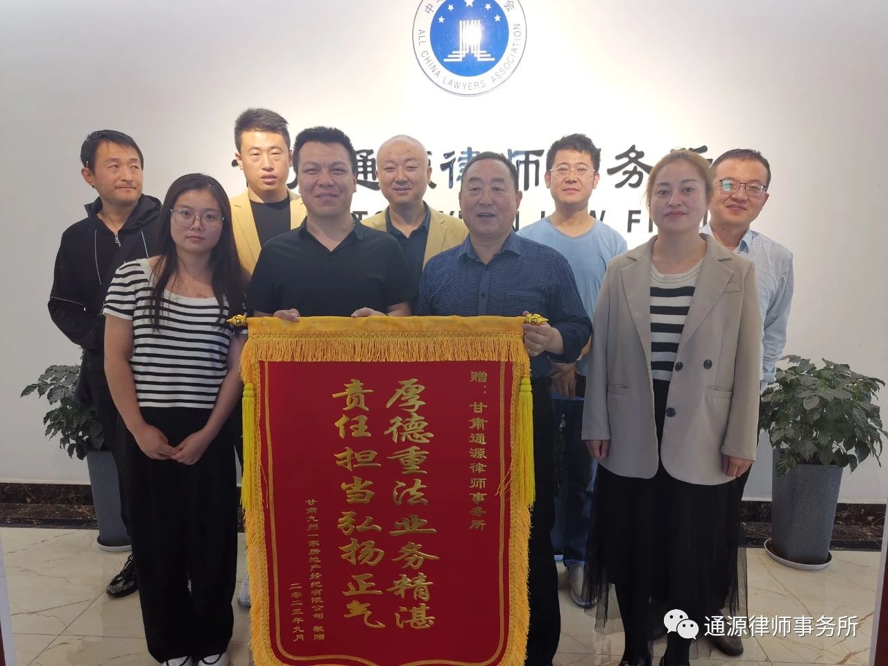 九州一家为了感谢通源律师的专业指点与耐心帮助,特赠送锦旗表示感谢,鲜红的锦旗是其对通源律师办案的认可,也是对通源律师事务所的鼓励与支持!