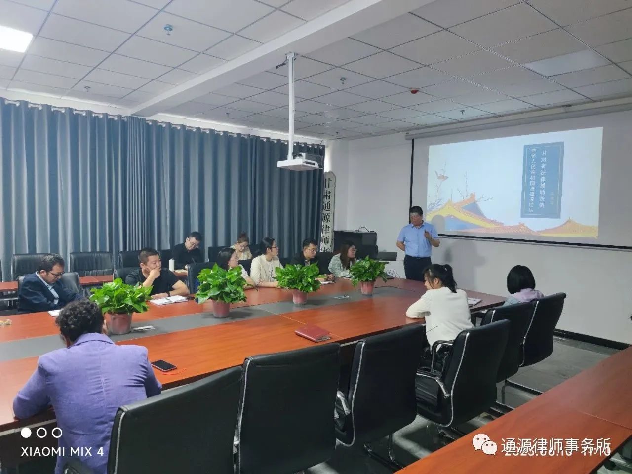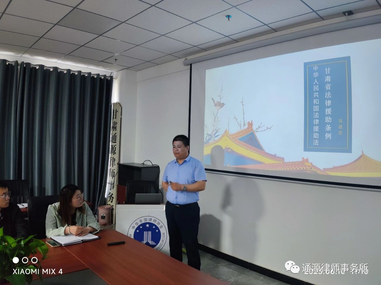 2023年6月10日上午,甘肃通源律师事务所举办第六期【通源·开讲啦】讲学活动,为了进一步宣传贯彻《中华人民共和国法律援助法》、《甘肃省法律援助条例》,结合全省“三抓三促”活动,维护经济困难群众和弱势群体的合法权益,提高全所律师办理法律援助案件的主动性、自觉性,提高法律援助案件的办案质量,本次讲学主题为《法律援助案件的办理》,主讲人:本所主任高建忠。