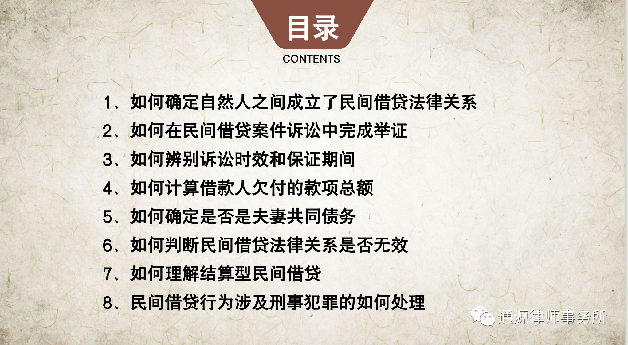 本次讲学紧紧围绕常见的民间借贷案件纠纷展开,具体内容分别为:1、如何确定自然人之间成立了民间借贷法律关系;2、如何在民间借贷案件诉讼中完成举证;3、如何辨别诉讼时效和保证期间;4、如何计算借款人欠付的款项总额;5、如何确定是否是夫妻共同债务;6、如何判断民间借贷法律关系是否无效;7、如何理解结算型民间借贷;8、民间借贷行为涉及刑事犯罪如何应对。