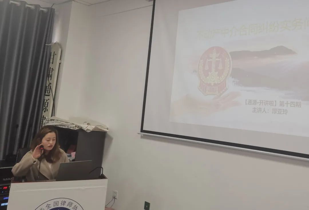 2023年10月28日上午,甘肃通源律师事务所举办第十四期【通源·开讲啦】讲学活动,本次讲学由甘肃通源律师事务所专职律师厚亚玲,以“不动产中介合同纠纷实务问题的探析”为专题进行讲座。会议由我所主任高建忠主持,律所全员参加学习。