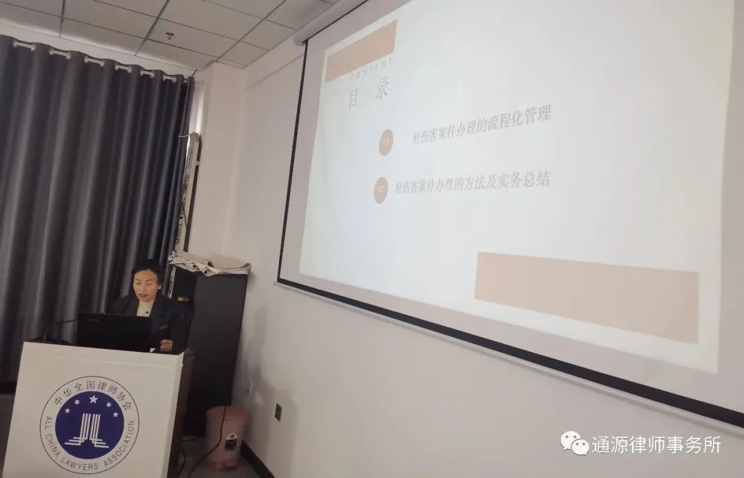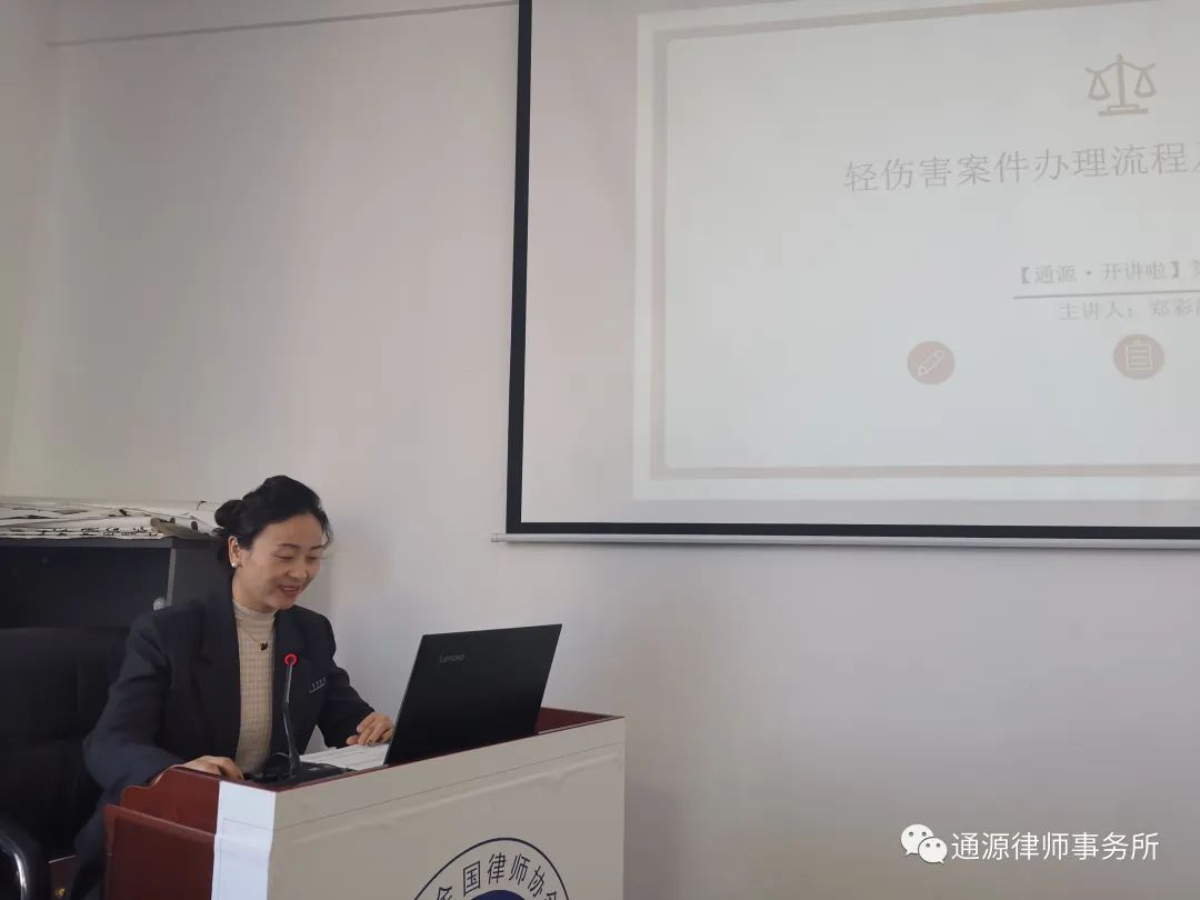 2023年10月14日上午,甘肃通源律师事务所举办第十三期【通源·开讲啦】讲学活动,本次讲学由甘肃通源律师事务所专职律师郑彩霞,以“轻伤害案件办理流程及实务问题总结”为专题进行讲座。会议由我所主任高建忠主持,律所全员参加学习。