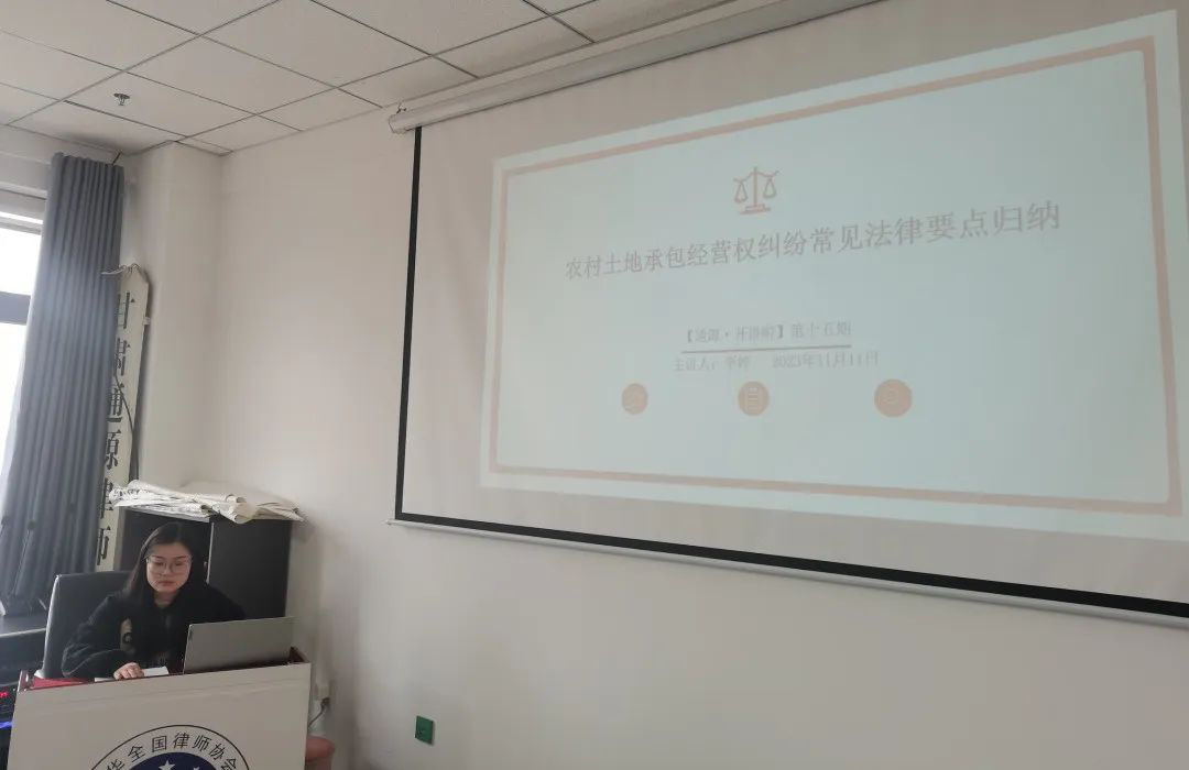 2023年11月11日上午,甘肃通源律师事务所举办第十五期【通源·开讲啦】讲学活动,本次讲学由甘肃通源律师事务所专职律李婷,以“农村土地承包经营权纠纷常见法律要点归纳”为专题进行讲座。会议由我所主任高建忠主持,律所全员参加学习。
